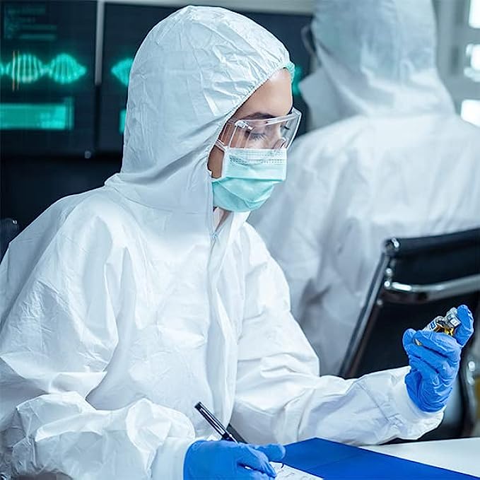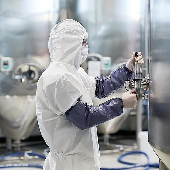 Protective PTFE micro-film material over Spunbond Breathable PP. This coverall provides enhanced durability, breathability and comfort to the workers.