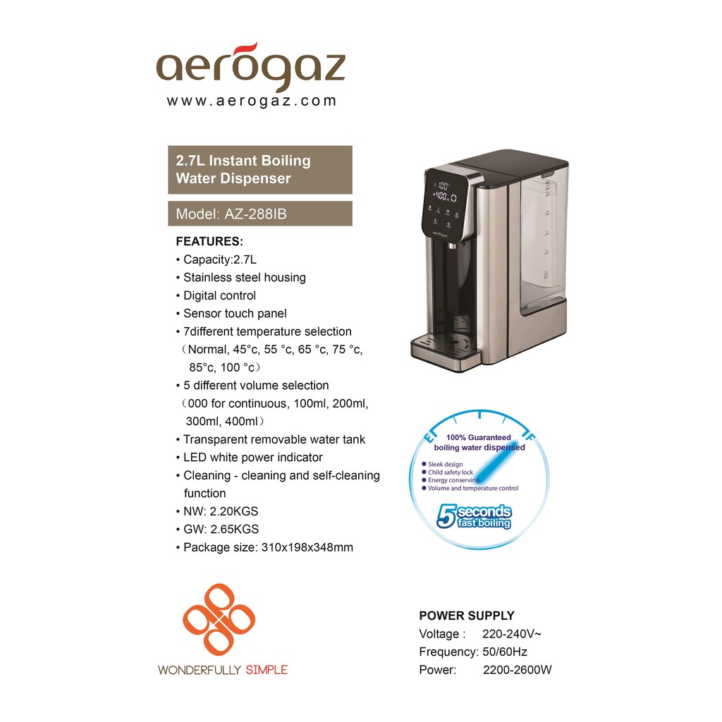 Aerogaz 2.7L Instant Boiling Water Dispenser( AZ 288IB)